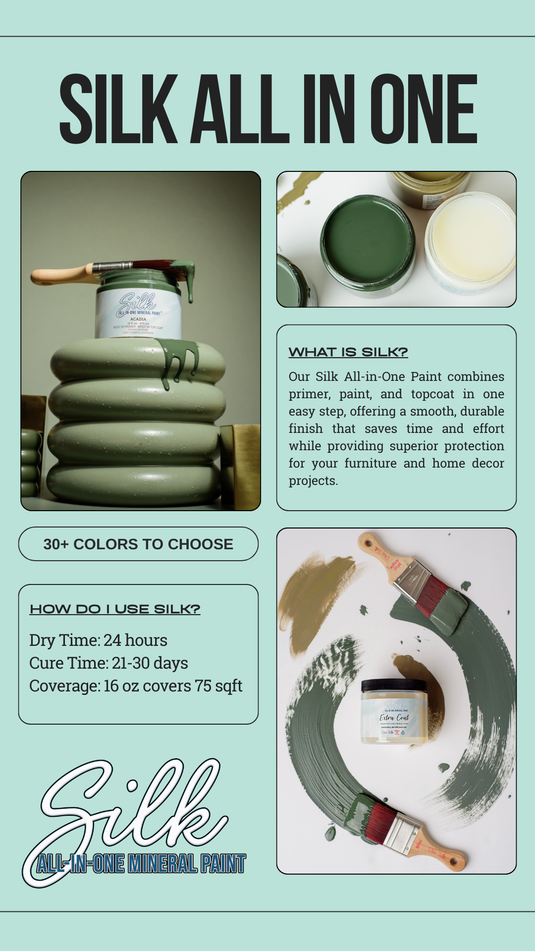An educational graphic for Dixie Belle Paint Co. highlighting the Silk Paint line, designed using brand-aligned visual elements to clearly communicate its key properties and benefits while maintaining a cohesive aesthetic.