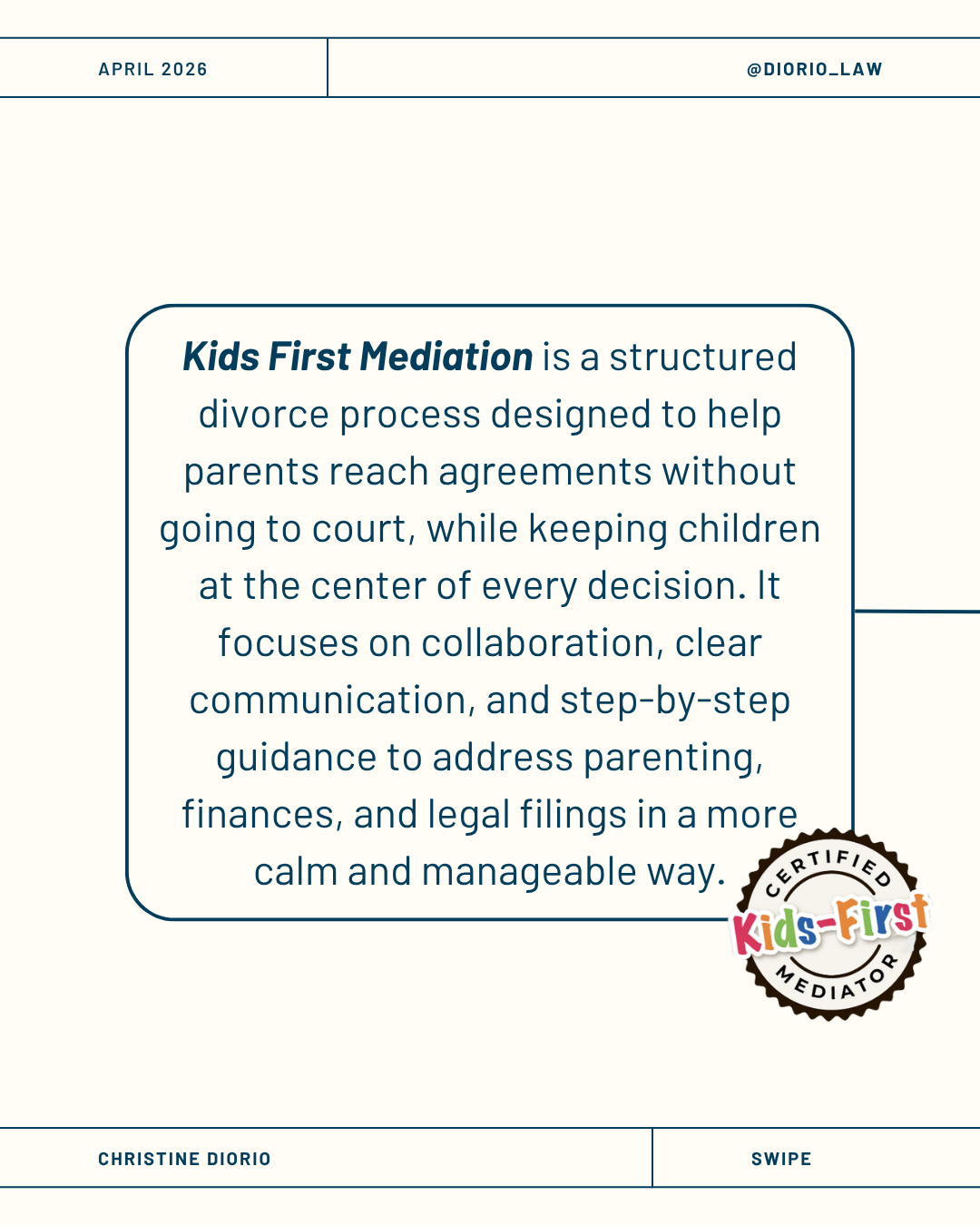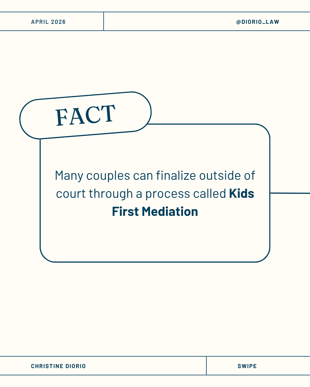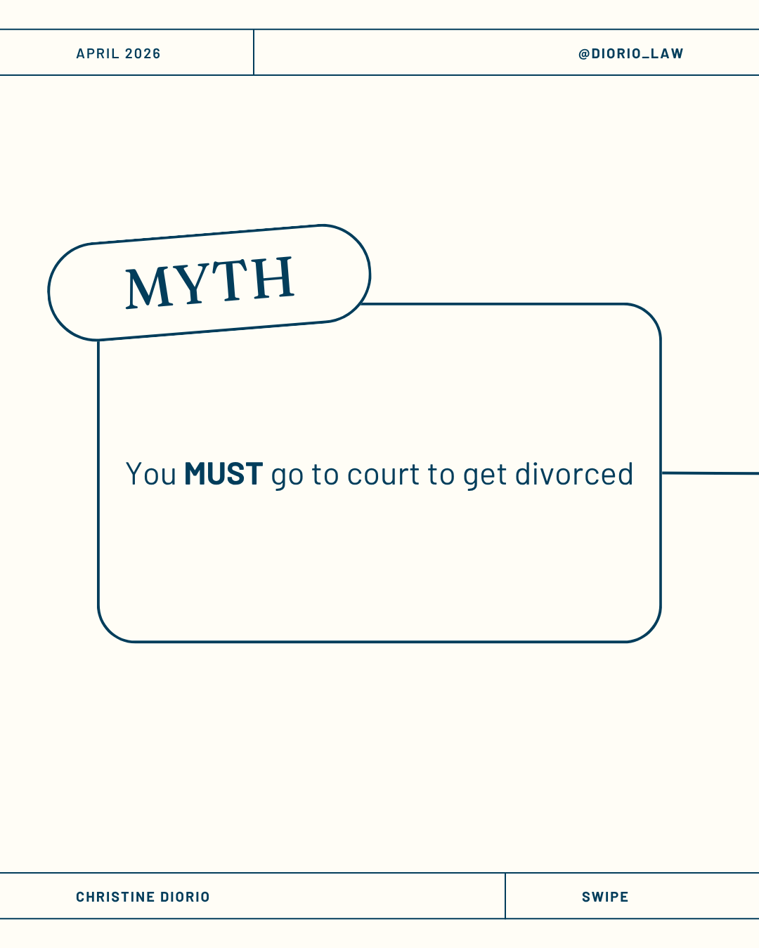 An on-brand educational carousel for Diorio Law debunking common divorce myths and highlighting mediation as a child-focused alternative to court proceedings, designed to inform clients with clarity and compassion.
