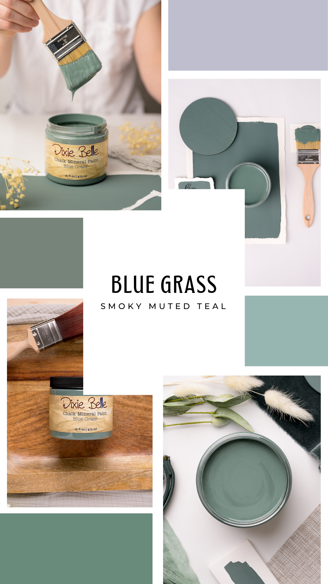 A clean product showcase highlighting “Blue Grass” from Dixie Belle Paint Co.’s Southern Collection. Designed to visually emphasize the color and its tone in a simple, brand-focused format.